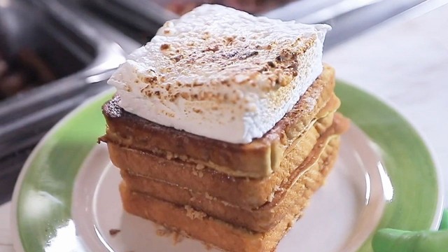 Guy Fieri's checkin' in with some top-notch Triple-D spots for the-bomb breakfast, burgers and bison! First, creative comfort is still kickin' at this Boston joint, bringing a sinful s'mores French toast tower to the first meal of the day. Next, a bookstore-slash-café in Duluth is going strong with over-the-top eats like killer kimchi Japanese pancakes with salmon and savory braised bison with polenta. And an old-school institution in West Lafayette, Ind., is still crankin' out classics with a twist, like outrageous sausage gravy burgers, plus sweet-and-tangy tenders and biscuits.