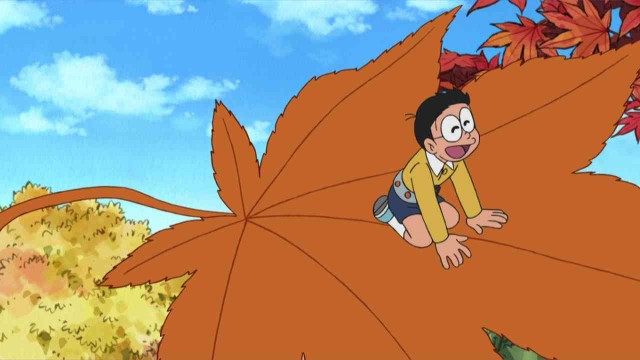 「落ち葉とジャイ子」 スネ夫からバンジージャンプの話を聞き、びびってしまうのび太。しずかの前でバカにされ、くやしいのび太は、「スリルのないバンジージャンプを出して」とドラえもんに頼み込む。 ドラえもんが出したのは『ガリバートンネル』。さっそくガリバートンネルで小さくなった二人は、『即席(そくせき)エレベーター』で木の枝まで上る。そこでドラえもんは『落ち葉ンジー』を取り出す。これを腰に巻くと木の葉の上に乗ることができ、葉っぱと共に風に吹かれて舞うように落ちていく感覚を味わうことができるのだ。 「これなら怖くない!」とよろこんだのび太はみんなを誘うが、ジャイアンは呼び止める声にも気づかない。実は、ジャイ子が入院してしまったのだ。「窓から見える木の葉っぱが全て落ちたら、私の命も終わるんだわ」と言い出すジャイ子。ところが、それを知らないのび太たちは、病院の庭の大きな木で落ち葉ンジージャンプをはじめて…!? 「しずかちゃんになったのび太」 学校の帰り道、しずかに「クッキーを焼いたから食べに来て」と誘われたのび太は、大よろこびで帰宅するが、ママから草むしりを頼まれていたことを思い出す。だが、自分が行かないと出木杉としずかが二人で仲良く食べてしまうと考え、こっそり出かけようとしたところ、ママに見つかってしまった! ママに言われるがまま、のび太が机に向かって宿題を始めると、後ろに立っていたママが突然笑い出す。実はママだと思っていたのはドラえもんで、ママの着ぐるみを着ていたのだ。怒ったのび太は、再び出かけようとするが、今度は本物のママから草むしりをするよう言われてしまう。 困っているのび太を見たドラえもんは、『フリーサイズぬいぐるみカメラ』と『どこでもドア』を出すと、どこでもドアからしずかの写真を撮る。すると、カメラから飛び出てきた小さなかたまりが、あっという間にしずかのぬいぐるみになったからビックリ! のび太はしずかのぬいぐるみを着て、出木杉のもとへと向かうが…!?