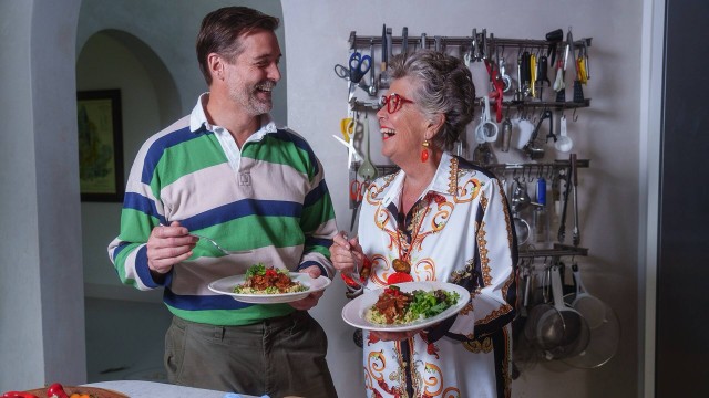 Prue is joined by designer and TV presenter Patrick Grant - who makes slow-cooked fenugreek lamb - John builds a bold dovecote, and there are tips for making cakes.