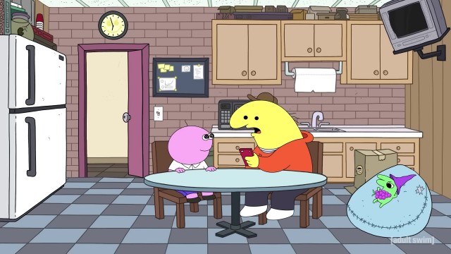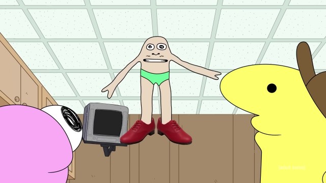 Finally we learn about Glep, one of the characters at Smiling Friends - the green one who sits on the bean bag and spits on the ground and stuff like that. *Growls at you*