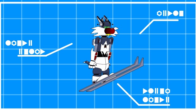 It's V for victory as Bugs soars off the ramp and walks us through the mechanics of ski jumping.