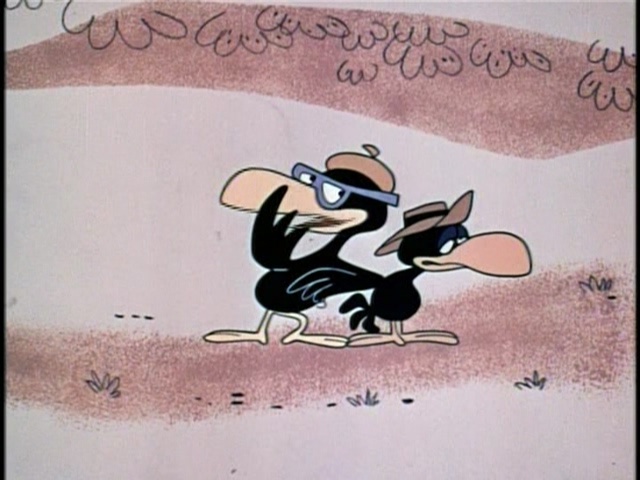 Those little green men holding extremely ominous-looking weapons aren't congressmen, as Bullwinkle first surmises--they're Gidney and Cloyd, reluctant visitors from the moon, here to keep an invasion of earth tourists from cluttering up their homeland. Indeed, just to prepare for their visit, the two have had to practice dodging traffic, listening to jukeboxes, filling out forms, and breathing smog! Meanwhile, Boris and Natasha, twelve stories up, with a heavy safe as our heroes stroll by below, finally receive orders from headquarters: KILL MOOSE!