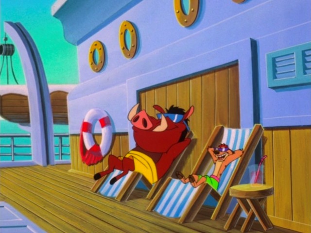 Pumbaa and Timon go on a cruise ship, but after a run-in with the captain they find themselves at the wheel of the boat, fighting over who's going to be captain. Their ship nows goes through Los Angeles, is attacked by an octopus and it lands in a totally different bed of water.