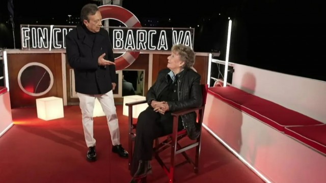 Dacia Maraini dialoga con Piero Chiambretti su una barca che naviga sul fiume Tevere, nel cuore di Roma.